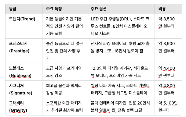 A4. 가장 저렴한 기본 등급은 엔트리급 사양으로, 일부 첨단 기능과 옵션이 빠져 있을 수 있습니다. 반면, 고급 등급은 프리미엄 인테리어, 전동 시트, 파노라마 선루프, 고급 사운드 시스템 등이 포함됩니다. 구매 시 원하는 기능에 맞춰 선택하는 것이 좋습니다.