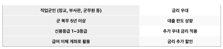 카카오뱅크에서는 군인 대출 추천 상품을 제공하면서 직업군인에게 아래와 같은 우대 조건을 적용합니다.