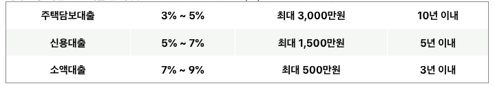 대출 금리: 금리는 대출 종류와 군인의 신용도에 따라 다릅니다. 보통 금리는 연 3% ~ 7%로 제공됩니다.