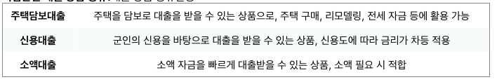 이와 같은 다양한 대출 상품은 군인들에게 큰 도움이 됩니다.