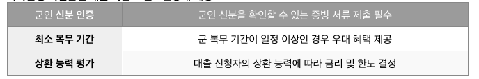 장점: 대출 한도 상향 조정, 군인 전용 상품